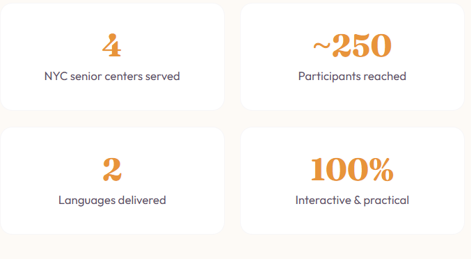 250+ workshop participants trained across NYC senior centers and community programs.