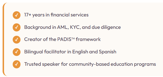 She brings more than 17 years of experience from a global financial institution, where she contributed to major Anti-Money Laundering, KYC, and client due diligence initiatives across international markets. Today, she translates that risk-awareness background into community-based education that is practical, human-centered, and prevention-first.