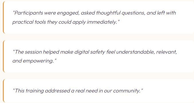 For organizations that need a more customized solution — staff-facing training, tailored program design, and speaking engagements focused on digital safety, scam prevention, and autonomy in the AI era.
